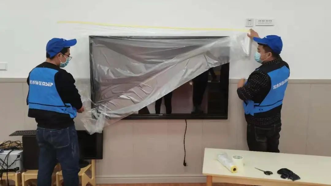 進場后施工人員先對屋內的家具、電腦電器等使用了遮蔽膜遮蔽保護。